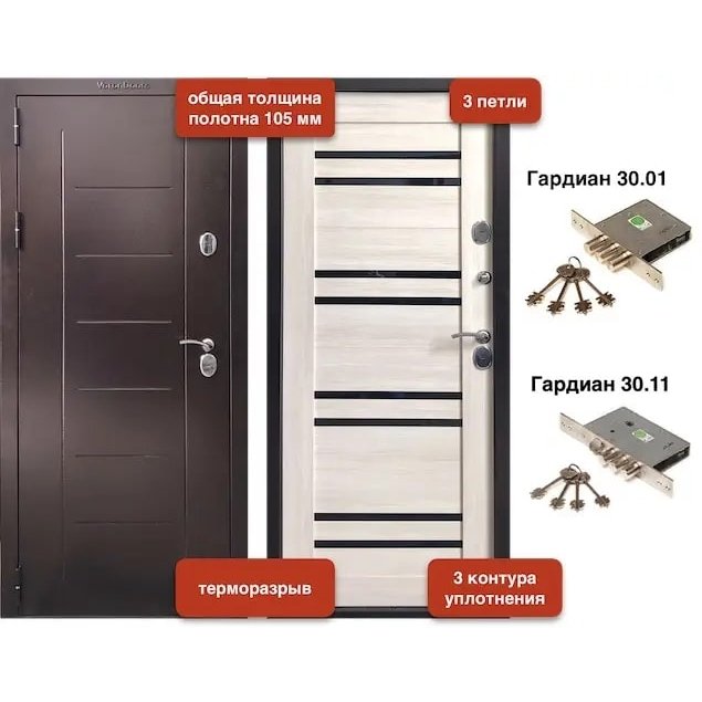 Толщина дверного полотна: общая 105 мм., по металлу 100 мм.